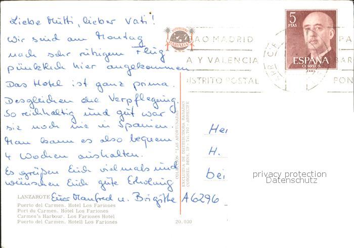 old postcard Lanzarote Kanarische Inseln Puerto del Carmen Hotel Los Fariones Fliegeraufnahme postalisch gelaufen Erhaltung siehe scans