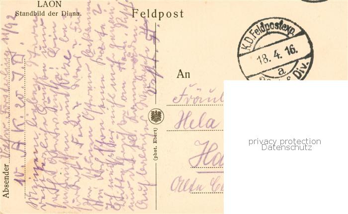 13794092 Laon 02 Aisne Standbild d. Diana – Feldpost postalisch gelaufen Feldpostexpedition (Stempel) Erhaltung siehe scans [LiesaD40] Feldpostexpedition (Stempel) carte postale Lies Katcode 11170002202408