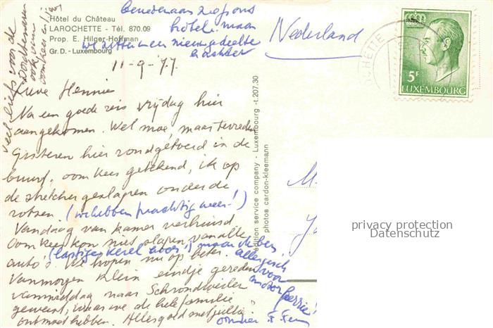 74141880 alte Postkarte Larochette Luxembourg Hôtel du Château vue aérienne postalisch gelaufen Fliegeraufnahme Erhaltung siehe scans [FriedD77] KatCode: 11300