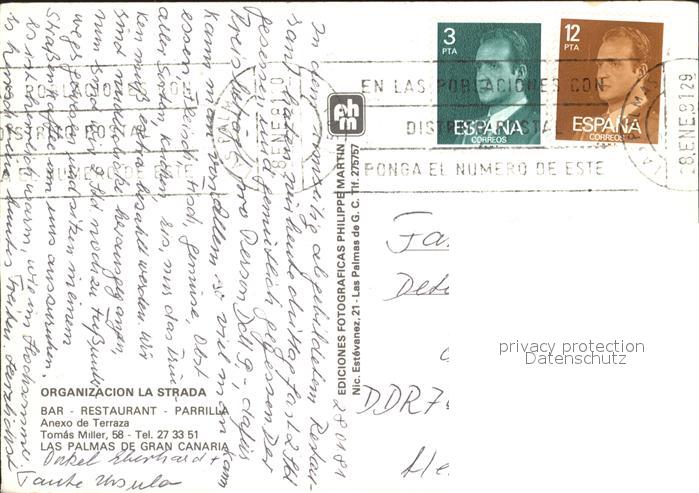 old postcard Las Palmas Gran Canaria Bar Restaurant Self Service La Strada postalisch gelaufen Erhaltung siehe scans