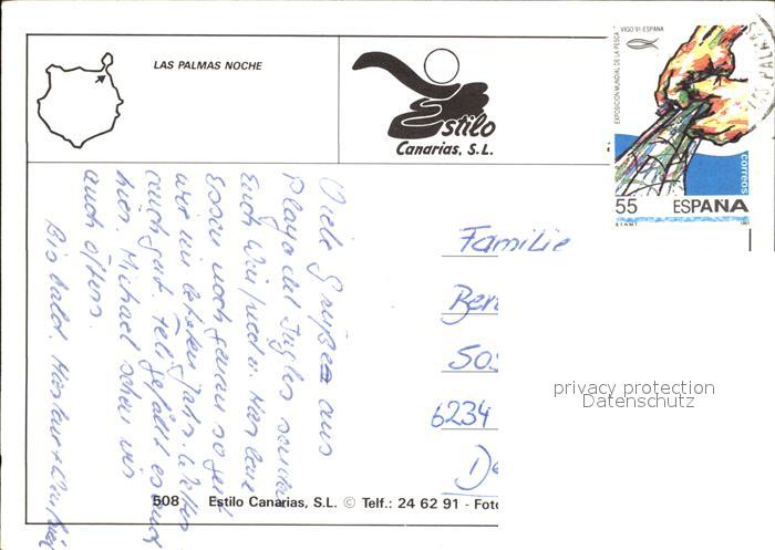 old postcard Las Palmas Gran Canaria de noche Nachtaufnahme postalisch gelaufen Erhaltung siehe scans