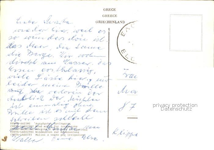 old postcard Lassithi Windmuehlen zur Bewaesserung Landschaft postalisch gelaufen Erhaltung siehe scans