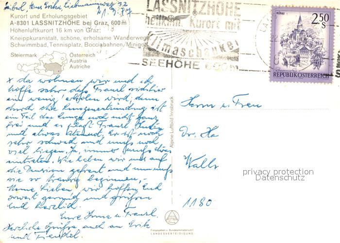 73340310 alte Postkarte Lassnitzhoehe Kurort Erholungsgebiet Fliegeraufnahme postalisch gelaufen Erhaltung siehe scans [FriedD77] KatCode: 11390221060628