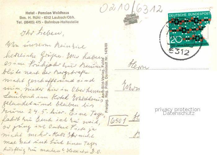 72909003 alte Postkarte Laubach Hessen Hotel Pension Waldhaus Fliegeraufnahme postalisch gelaufen Erhaltung siehe scans [FriedD77] KatCode: 11110006531010