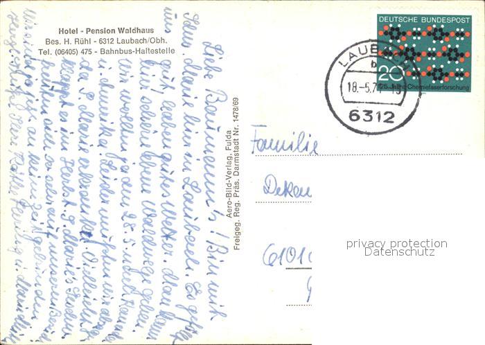 72596488 alte Postkarte Laubach Hessen Hotel Pension Waldhaus Fliegeraufnahme postalisch gelaufen Erhaltung siehe scans [FriedD77] KatCode: 11110006531010