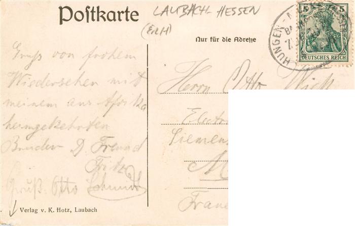 73939612 Laubach Hessen Ortsansicht postalisch gelaufen Bahnpost Erhaltung siehe scans [FriedD77] Bahnpost alte Postkarte Frie Katcode 11110006531010