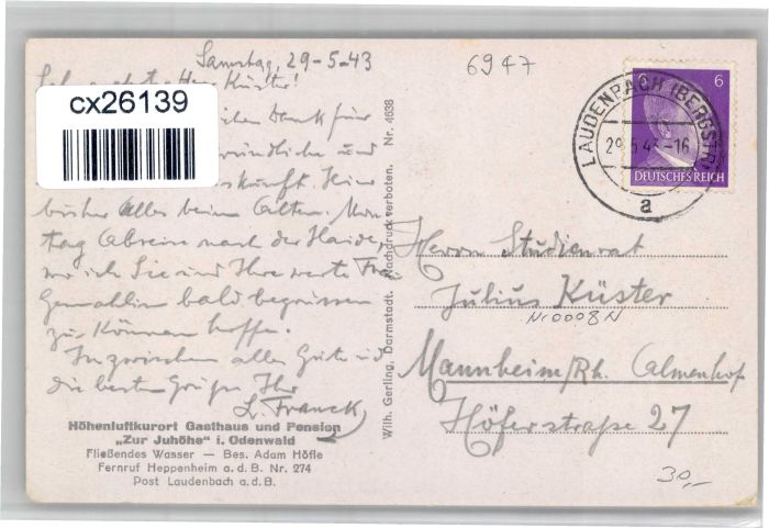 30826842 alte Postkarte Laudenbach Bergstrasse [Stempelabschlag] Gasthaus Pension zur Juhoehe postalisch gelaufen KatCode: 11110008226040