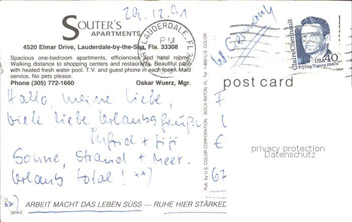 71859368 old postcard Lauderdale Florida Southers Apartements Fliegeraufnahme mit Strand postalisch gelaufen Erhaltung siehe scans KatCode: 14140