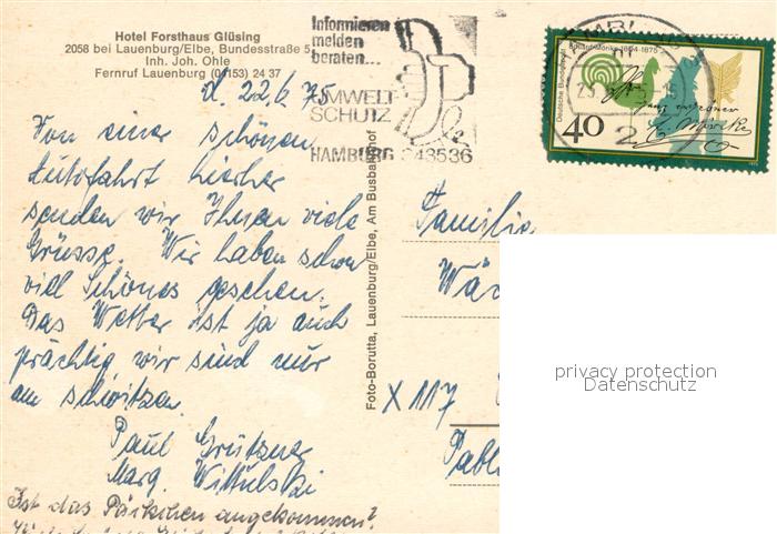 73652840 alte Postkarte Lauenburg Elbe Hotel Forsthaus Gluesing Restaurant postalisch gelaufen Erhaltung siehe scans [FriedD77] KatCode: 11110001053083
