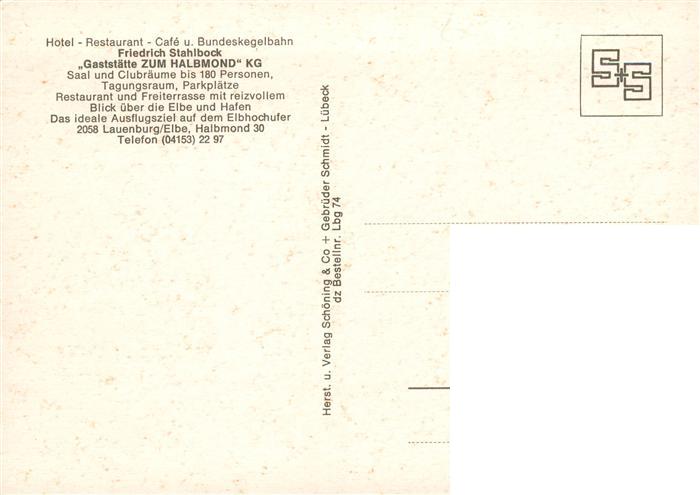 73897044 Lauenburg Elbe Panorama Gaststaette Zum Halbmond Kegelbahn Gastraum postalisch nicht gelaufen Erhaltung siehe scans [FriedD77] KatCode: 11110001053083