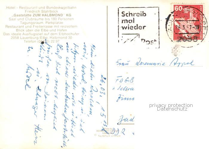 73756487 alte Postkarte Lauenburg Elbe Restaurant-Hotel Zum Halbmond Bundeskegelbahn Aussicht Terrasse Hafen postalisch gelaufen Erhaltung siehe scans [LiesaD40] KatCode: 11110001053083