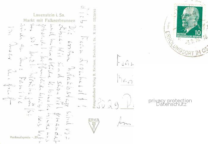 72643920 alte Postkarte Lauenstein Erzgebirge Markt mit Falknerbrunnen postalisch gelaufen Erhaltung siehe scans [FriedD77] KatCode: 11110014290140