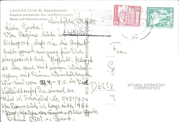 72000193 alte Postkarte Lauenstein Erzgebirge Markt und Falknerbrunnen postalisch gelaufen Erhaltung siehe scans KatCode: 11110014290140