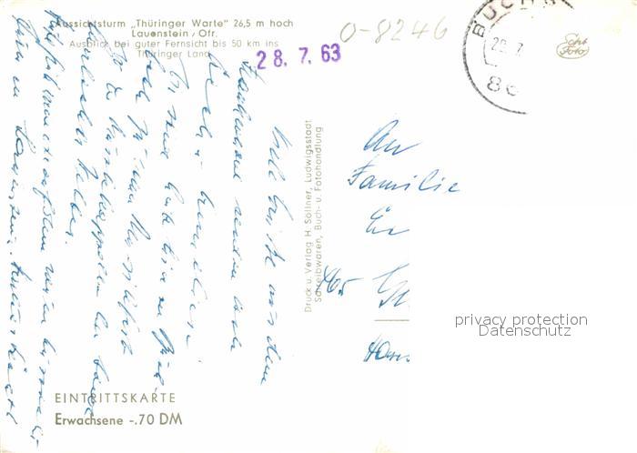 72796012 alte Postkarte Lauenstein Oberfranken Aussichtsturm Thueringer Warte postalisch gelaufen Erhaltung siehe scans [AndreD76] KatCode: 11110009476152
