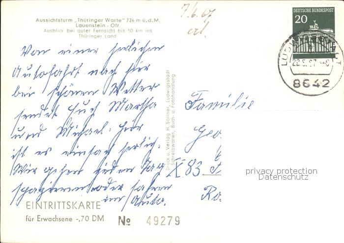 72370764 alte Postkarte Lauenstein Oberfranken Aussichtsturm Thueringer Warte Graefenthal Burg Lauenstein postalisch gelaufen Erhaltung siehe scans KatCode: 11110009476152
