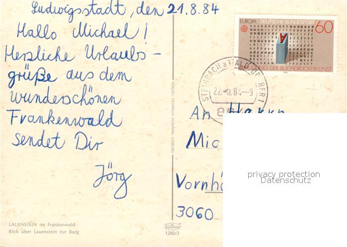73128846 alte Postkarte Lauenstein Oberfranken Blick ueber Lauenstein zur Burg postalisch gelaufen Erhaltung siehe scans [KathaD81] KatCode: 11110009476152