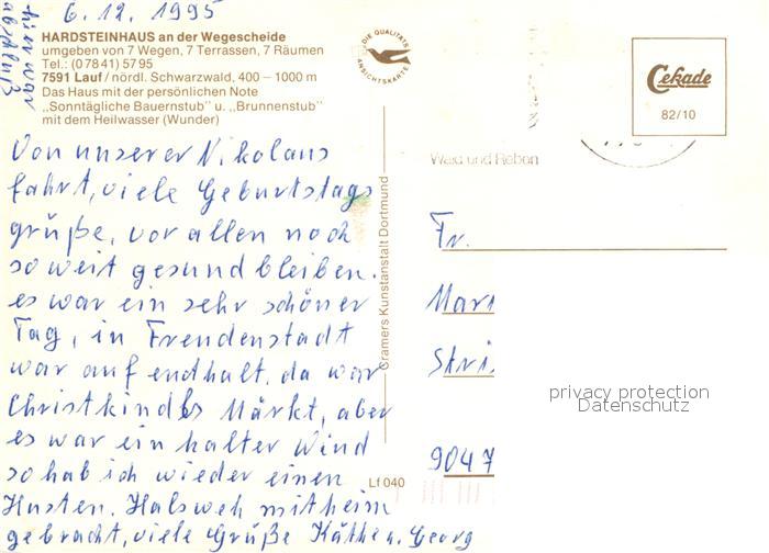 72991195 alte Postkarte Lauf Baden Hardsteinhaus an der Wegescheide Bauernstube Gaststaette postalisch gelaufen Erhaltung siehe scans [FriedD77] KatCode: 11110008317068