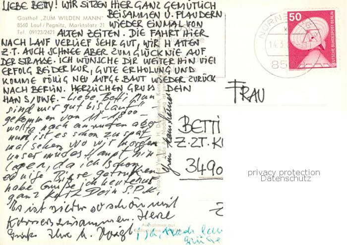 73866928 alte Postkarte Lauf Pegnitz Gasthof Zum Wilden Mann Gaststube Zimmer Ortspartie postalisch gelaufen Erhaltung siehe scans [WerneD78] KatCode: 11110009574138