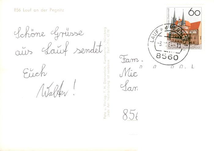 73884437 alte Postkarte Lauf Pegnitz Partie an der Pegnitz postalisch gelaufen Erhaltung siehe scans [WerneD78] KatCode: 11110009574138