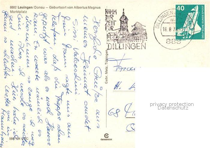 73177836 alte Postkarte Lauingen Donau Marktplatz Denkmal Schimmelturm Geburtsort von Albertus Magnus postalisch gelaufen Erhaltung siehe scans [FriedD77] KatCode: 11110009773144