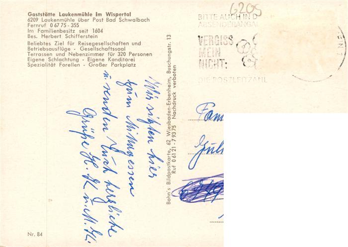 73936558 alte Postkarte Laukenmuehle Bad Schwalbach Gaststaette Laukenmuehle Im Wispertal postalisch gelaufen Erhaltung siehe scans [FriedD77] KatCode: 11110006439002