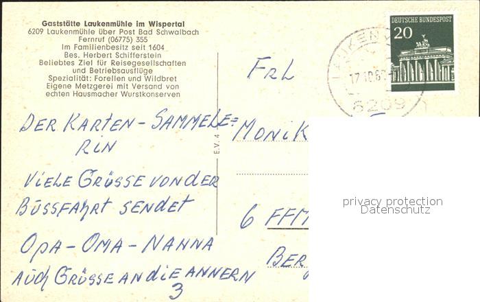 72096814 alte Postkarte Laukenmuehle Bad Schwalbach Gaststaette Laukenmuehle postalisch gelaufen Erhaltung siehe scans KatCode: 11110006439002