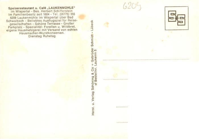 73936617 Laukenmuehle Bad Schwalbach Restaurant Cafe Laukenmuehle im Wispertal Jagdzimmer Raeuchertellr Panorama postalisch nicht gelaufen Erhaltung siehe scans [FriedD77] KatCode: 11110006439002