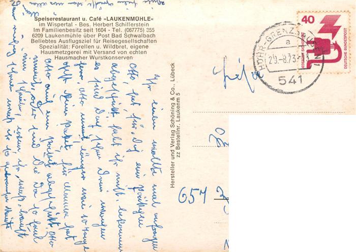 73895151 alte Postkarte Laukenmuehle Bad Schwalbach Restaurant Cafe Laukenmuehle im Wispetal Jagdzimer Raeucherteller Panorama postalisch gelaufen Erhaltung siehe scans [WerneD78] KatCode: 11110006439002