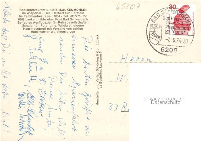 73865306 alte Postkarte Laukenmuehle Bad Schwalbach Restaurant Cafe Laukenmuehle Jagdzimmer Raeucherteller Panorama Wispertal postalisch gelaufen Erhaltung siehe scans [FriedD77] KatCode: 11110006439002