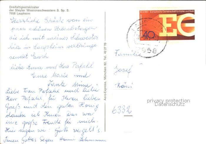 alte Postkarte Laupheim Dreifaltigkeitskloster der Steyler Missionsschwestern postalisch gelaufen Erhaltung siehe scans