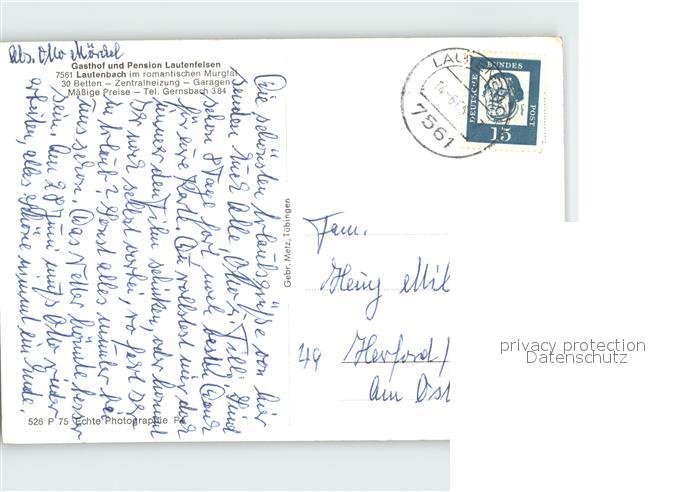 71998387 alte Postkarte Lautenbach Gernsbach Gasthof Pension Lautenfelsen postalisch gelaufen Erhaltung siehe scans KatCode: 11110008216017