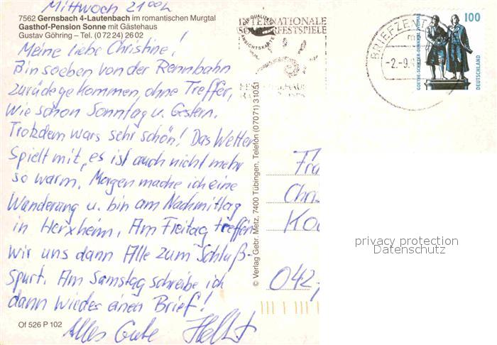 72752422 alte Postkarte Lautenbach Gernsbach Gasthof Pension Sonne mit Gaestehaus postalisch gelaufen Erhaltung siehe scans [FriedD77] KatCode: 11110008216017