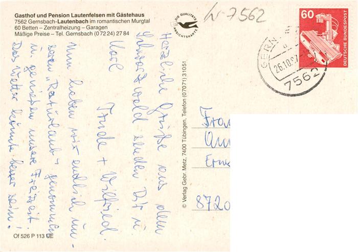 73897168 alte Postkarte Lautenbach Gernsbach Schwarzwald Gasthof Pension Lautenfelsen mit Gaestehaus Terrasse Gastraum Panorama postalisch gelaufen Erhaltung siehe scans [WerneD78] KatCode: 11110008216017