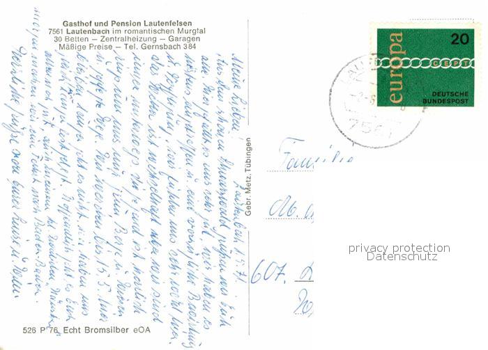 72710361 alte Postkarte Lautenbach Renchtal Murgtal Gasthaus Pension Lautenfelsen postalisch gelaufen Erhaltung siehe scans [LiesaD40] KatCode: 11110008317067