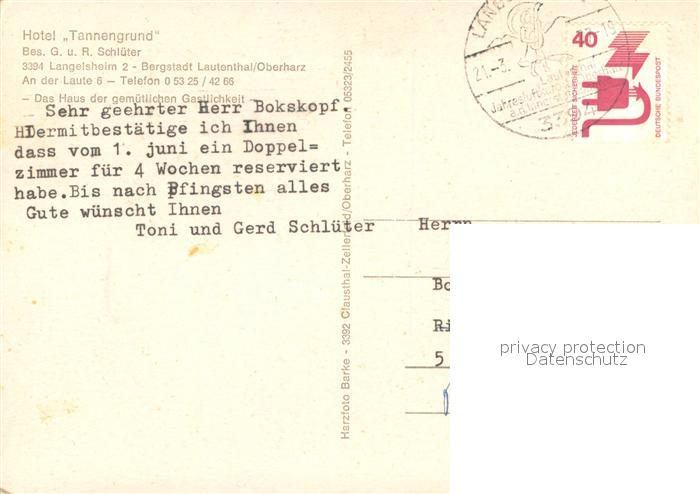 73726784 alte Postkarte Lautenthal Harz Hotel Restaurant Tannengrund postalisch gelaufen Erhaltung siehe scans [FriedD77] KatCode: 11110003153007