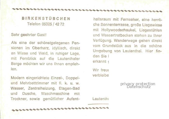 74043683 Lautenthal Harz Langelsheim Goslar Pension Café Birkenstuebchen Garten postalisch nicht gelaufen Werbekarte (keine Postkarte) Erhaltung siehe scans [FriedD77] KatCode: 11110003153007