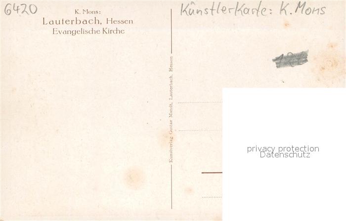 73706085 Lauterbach Hessen Evgl. Kirche Kuenstlerkarte K. Mons postalisch nicht gelaufen Erhaltung siehe scans [LiesaD40] KatCode: 11110006535011