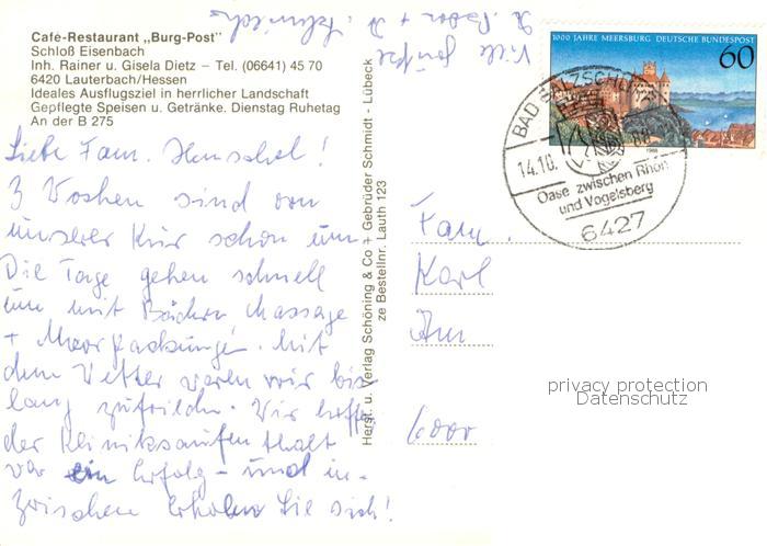 73758473 alte Postkarte Lauterbach Hessen Restaurant-Cafe Burg-Post Schloss Eisenach postalisch gelaufen Erhaltung siehe scans [LiesaD40] KatCode: 11110006535011