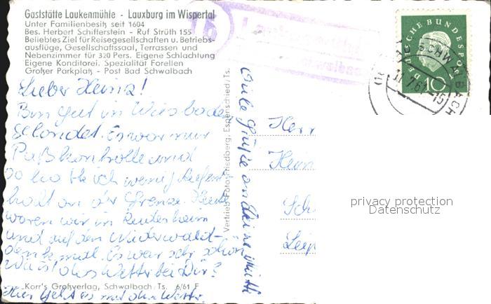 72460958 alte Postkarte Lauxburg Wispertal Gaststaette Laukenmuehle an der Wisper postalisch gelaufen Erhaltung siehe scans KatCode: 11110006439002