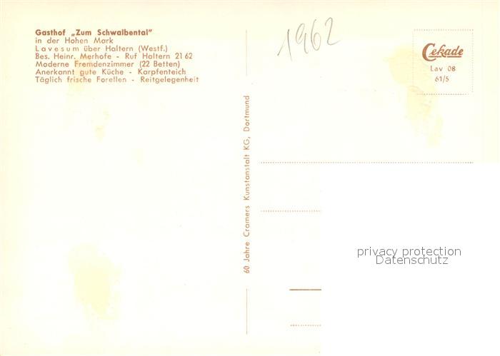 73662565 Lavesum Gasthof zum Schwalbental Gesellschaftsraum Karpfenteich Reitplatz postalisch nicht gelaufen Erhaltung siehe scans [FriedD77] KatCode: 11110005562016