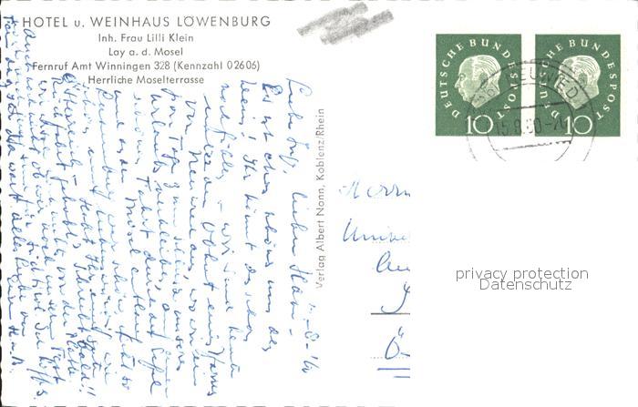 72374965 alte Postkarte Lay Mosel Hotel Weinhaus Loewenburg postalisch gelaufen Erhaltung siehe scans KatCode: 11110007111000