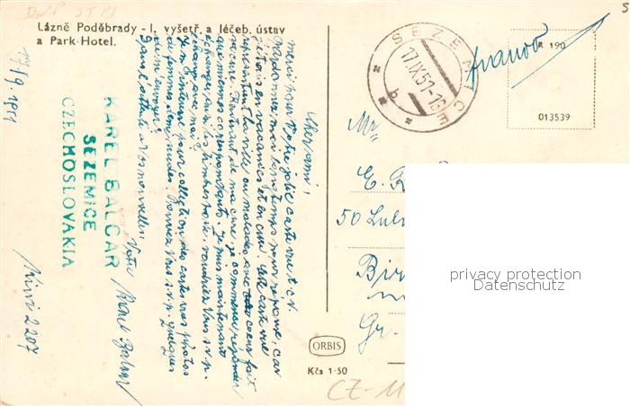 73849682 Lazne Podebrady CZ Park Hotel postalisch gelaufen Erhaltung siehe scans [WerneD78] old postcard Wern Katcode 11520