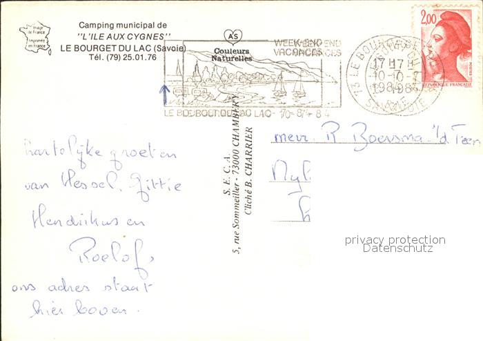 12241849 carte postale Le Bourget-du-Lac Savoie Camping Ile aux Cygnes postalisch gelaufen Erhaltung siehe scans KatCode: 11170073273051