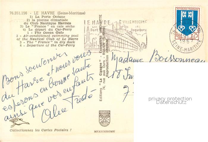 13586306 Le Havre Porte Océane Piscine Club Nautique Havrais Départ du Car Ferry postalisch gelaufen Erhaltung siehe scans [FriedD77] carte postale Frie Katcode 11170076276351