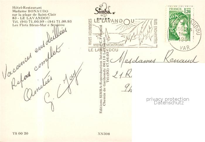 13593225 Le Lavandou Hôtel Restaurant Mme Bonaudo Plage de Saint Clair postalisch gelaufen Erhaltung siehe scans [FriedD77] carte postale Frie Katcode 11170083283070
