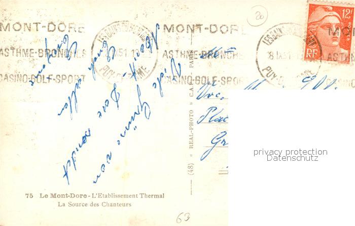 13524727 carte postale Le Mont-Dore Puy de Dome Etablissement Thermal La Source des Chanteurs postalisch gelaufen Erhaltung siehe scans [FriedD77] KatCode: 11170063263236