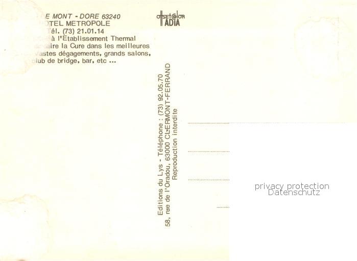 13638059 Le Mont-Dore Puy de Dome Hotel Metropole postalisch nicht gelaufen Erhaltung siehe scans [WerneD78] Wern Katcode 11170063263236