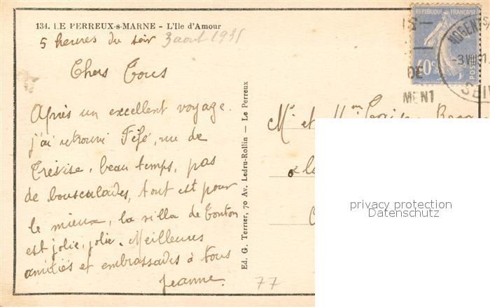 13552116 carte postale Le Perreux-sur-Marne Ile d Aour postalisch gelaufen Erhaltung siehe scans [WerneD78] KatCode: 11170094294058