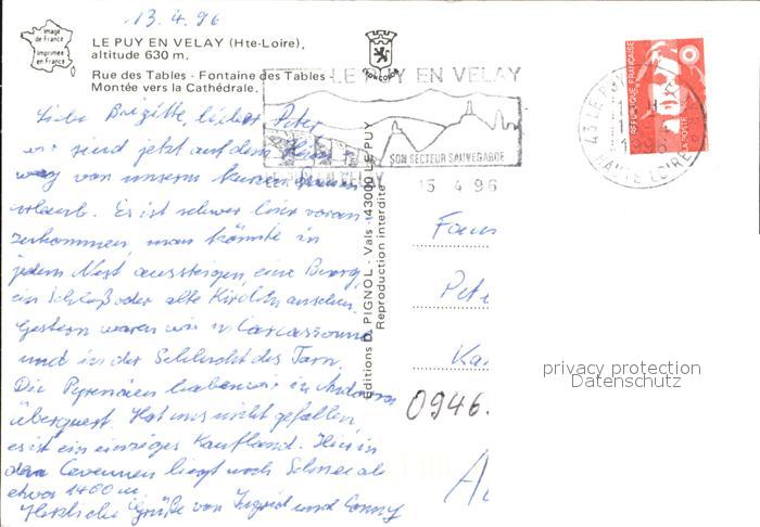 12436657 carte postale Le Puy-en-Velay Rue des Tables Fontaine des Tables Montee vers la Cathedrale postalisch gelaufen Erhaltung siehe scans KatCode: 11170043243157
