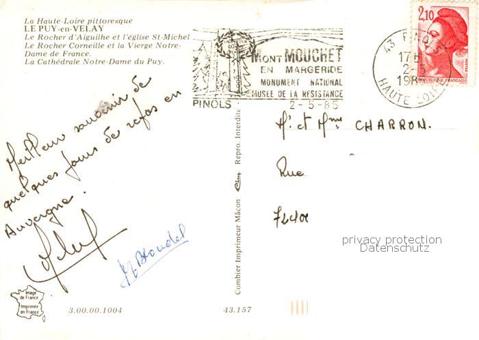 13835250 Le Puy-en-Velay Vue panoramique Rocher d Aiguilhe Eglise Saint Michel Rocher Corneille la Vierge Notre Dame de France Cathedrale Notre Dame du Puy postalisch gelaufen Erhaltung siehe scans [FriedD77] carte postale Frie Katcode 11170043243157